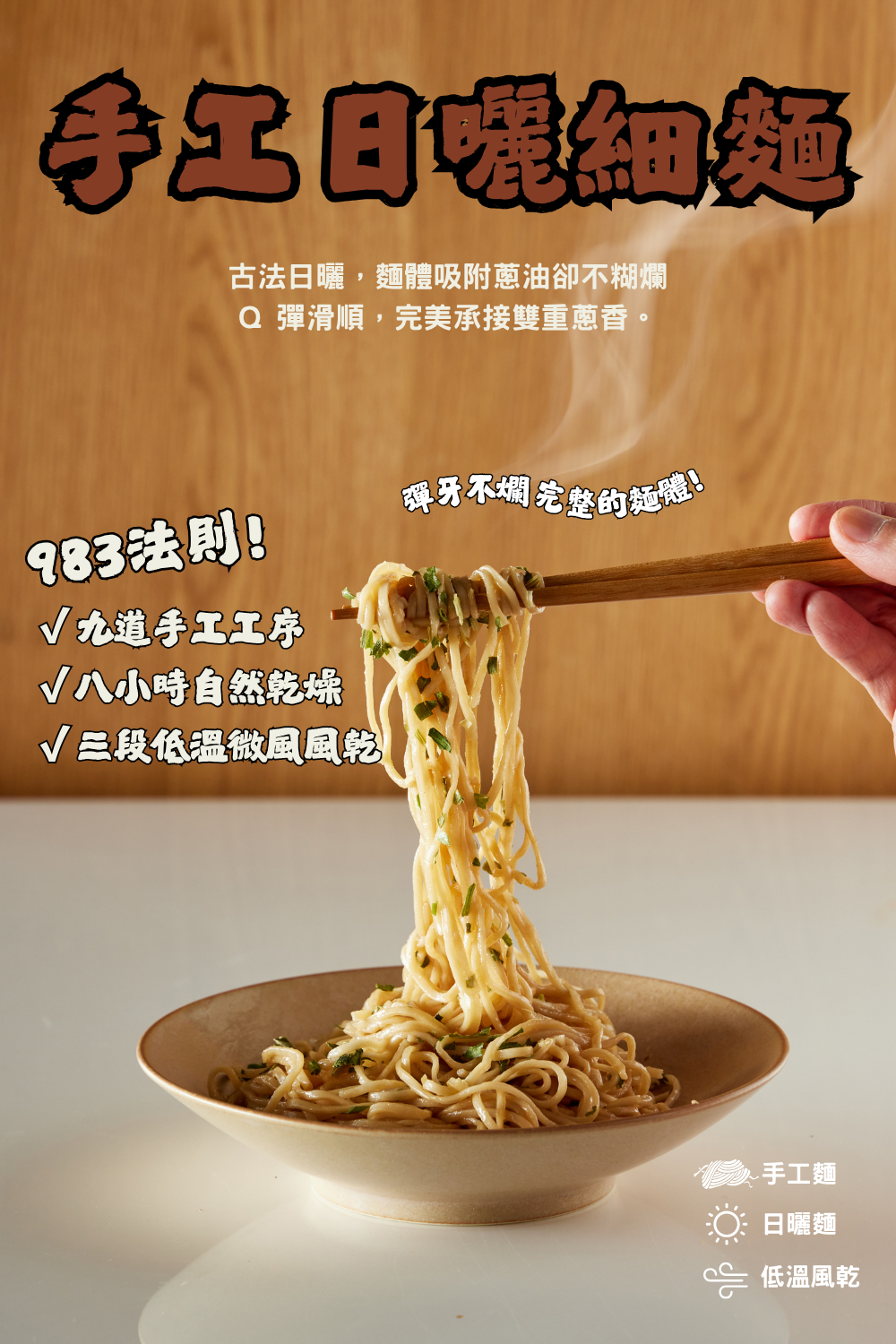 古法日曬,麵體吸附蔥油卻不糊爛,Q 彈滑順,完美承接雙重蔥香。